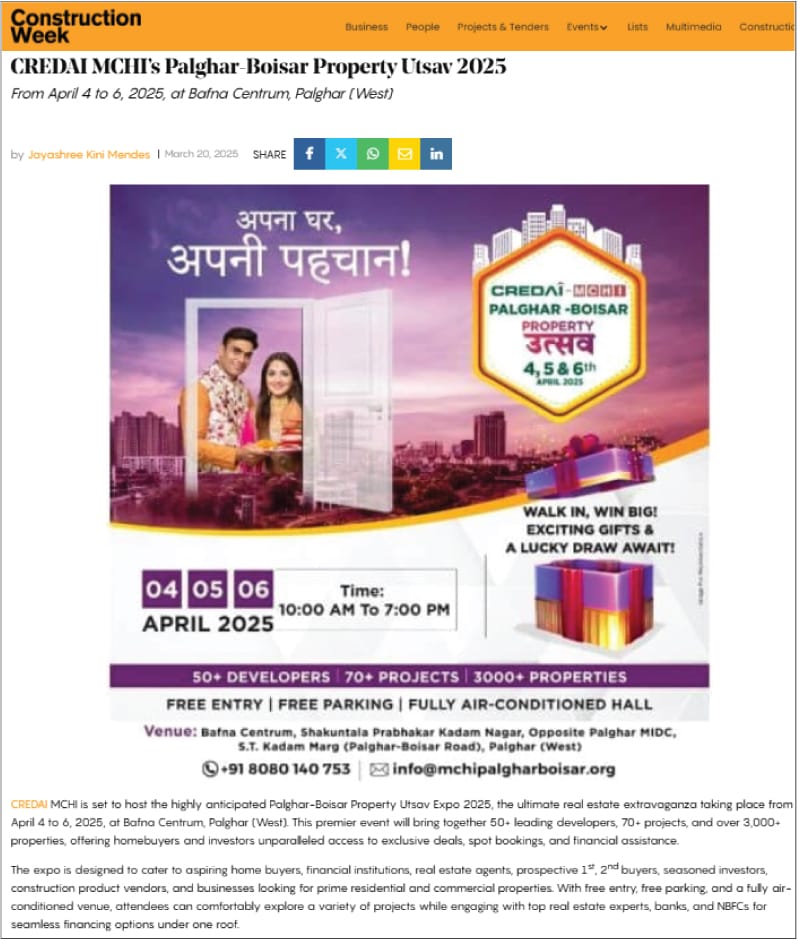 We crafted a compelling pre-event press release to generate buzz and attract maximum footfall for the CREDAI-MCHI Palghar Boisar Property Utsav. The coverage created strong media momentum, positioning the Property Utsav as a must-attend event and created significant awareness in the targeted geography.